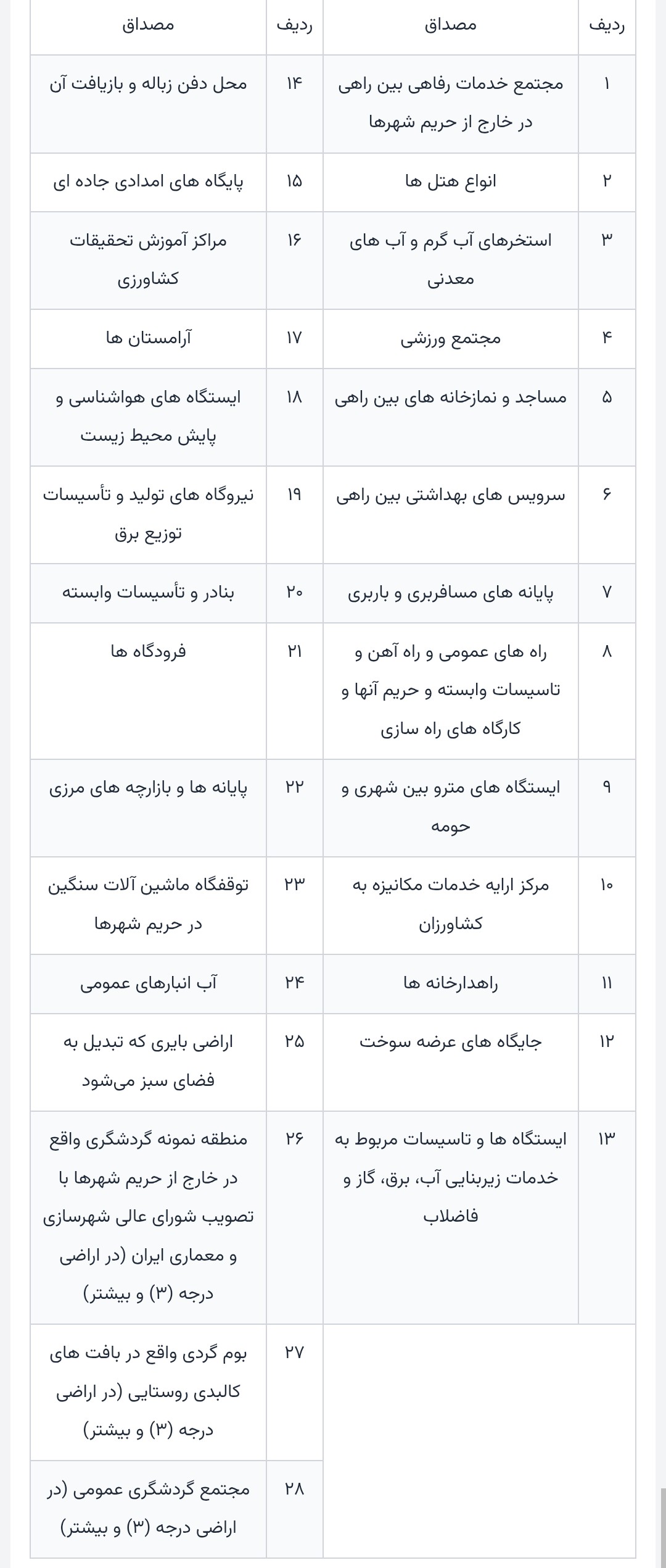 لیست کامل طرحهای خدمات عمومی مورد نیاز عموم مردم، که از پرداخت عوارض تغییر کاربری معاف هستند بدین شرح میباشد: